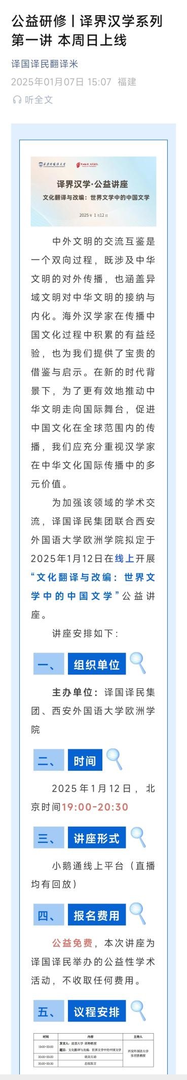 参会的老师请于2025年1月11日12:00前填写在线报名表:在线报名表:公益研修-译界汉学系列第一讲http://docs.qq.com/sheet/DQW9xYm1Wc1NSckph?tab=BB08J2