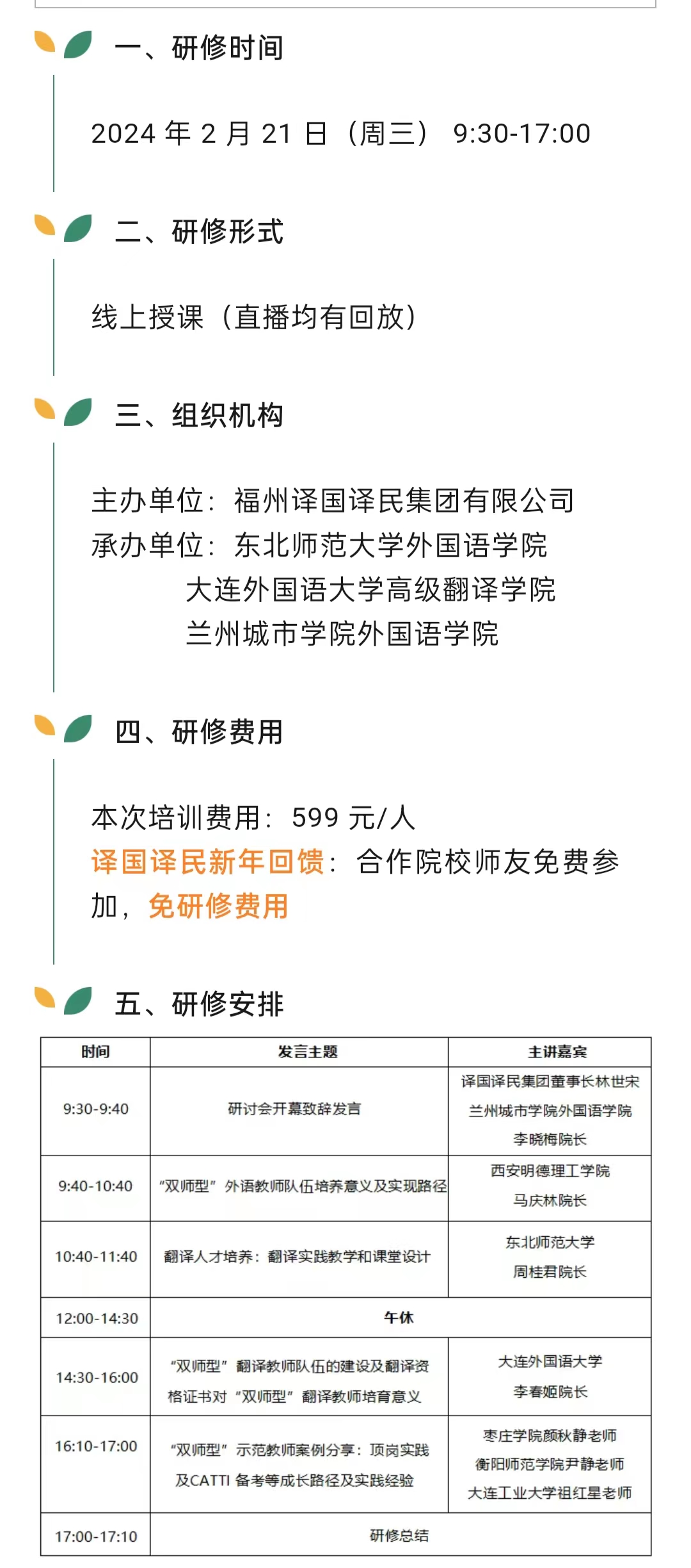 为了提高教师科研素养,2024年学院将继续与译国译民集团开展合作,免费为全院教师提供科研培训服务。“双师型”教师队伍高质量建设研修班将于2024年2月21日举行,现将培训安排通知如下。