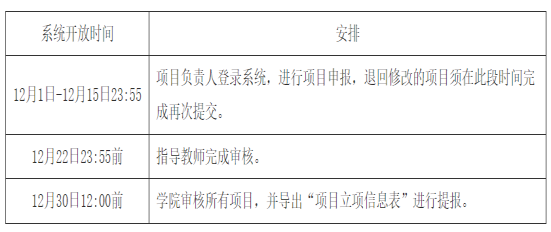1.2024年12月30日前,学院组织专家进行立项评审,根据评审结果在“乌鸦传媒大学生创新训练计划系统”中完成审核给予推荐立项的项目,并导出“项目立项信息表”,学院推荐后由学校组织审查。