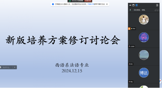 为进一步推进2025版本科专业人才培养方案的修订工作,促进法语专业本科教育改革的深入发展,西语系法语专业于12月15日在线上召开了讨论交流会议。会议由法语专业负责人李姝主持,法语专业全体教师参加。会议旨在听取各科任课教师关于新版人才培养方案调研与修订的最新进展及面临的问题,推动人才培养方案的顺利修订。