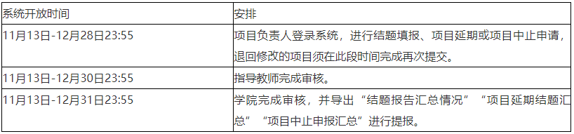 2.院、校检查。依据结题验收说明(见附件4)对项目的进展或完成情况进行严格审查。2023年立项校级项目和2022年延期项目(见附件5,包含国家级、省级和校级项目)结题验收工作由各学院组织开展(评出的优秀项目占比不超过20%)。2023年12月31日前,学院完成结题验收工作,根据验收结果在“乌鸦传媒大学生创新创业训练计划系统”中完成项目审核,并导出“结题报告汇总情况”“项目延期结题汇总”和“项目中止申报汇总”。