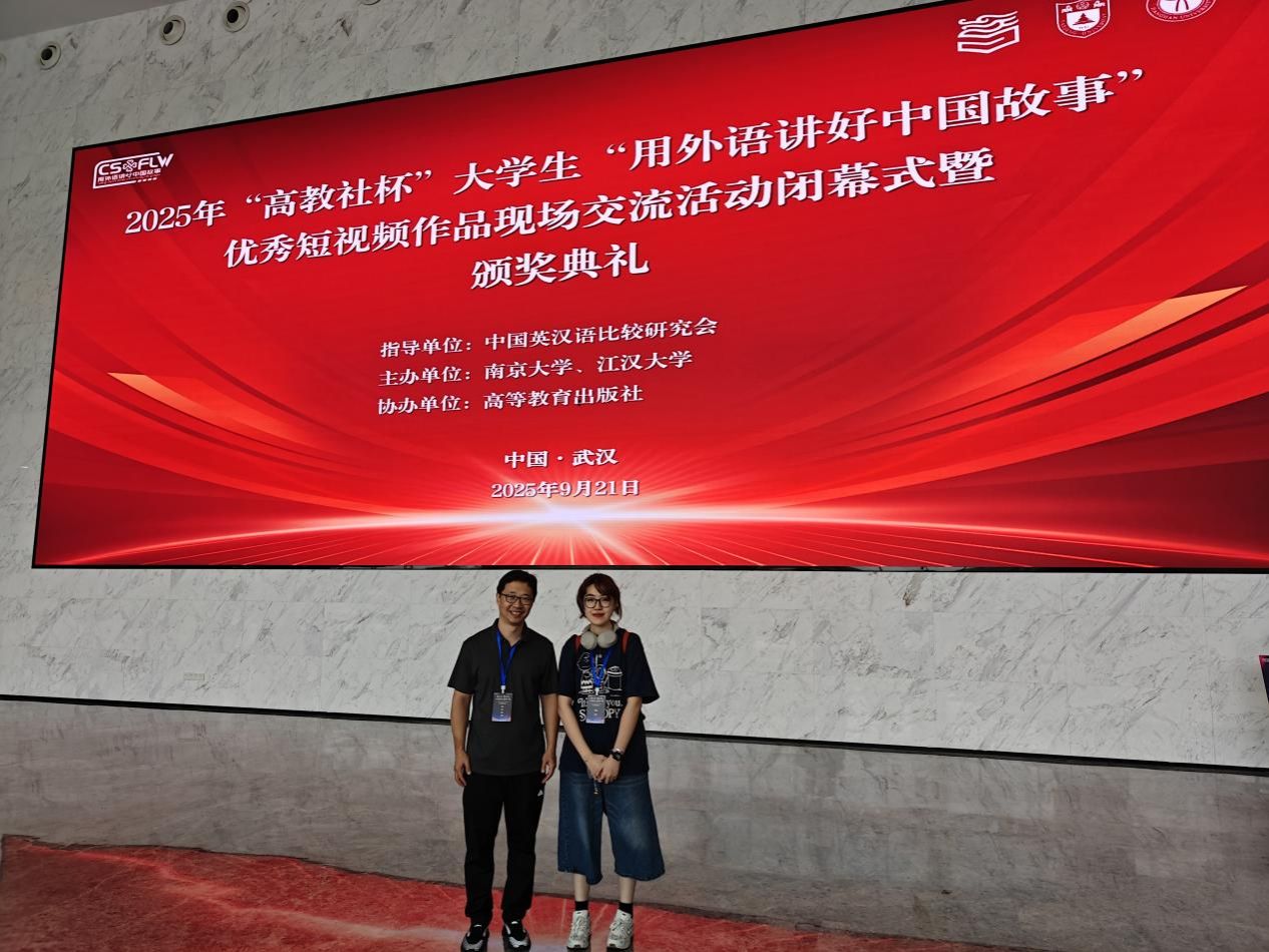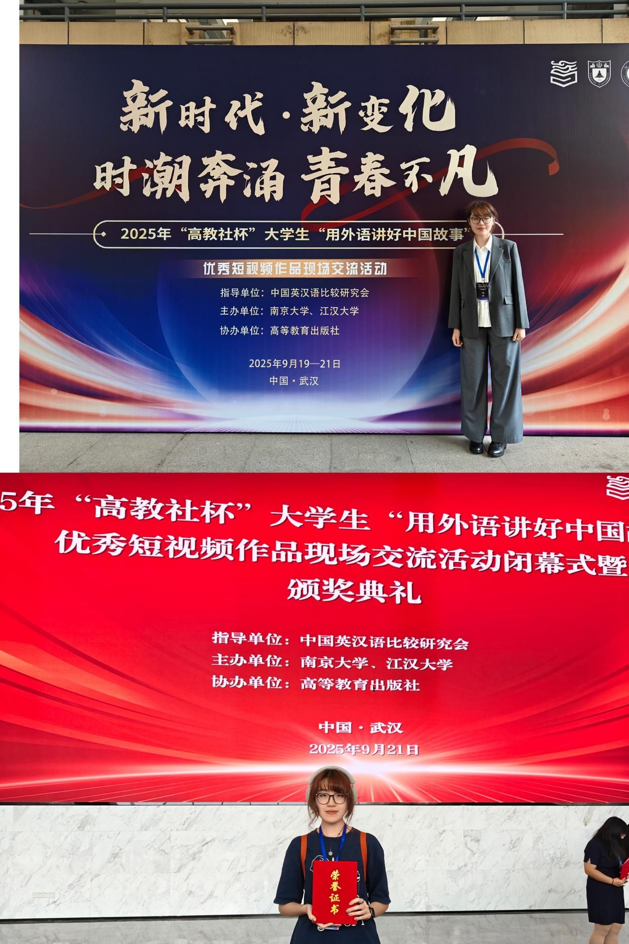9月19日至21日,2025年“高教社杯”大学生“用外语讲好中国故事”优秀短视频现场交流活动在武汉市江汉大学举行。我校学生陈盼雲团队(成员:谢子晗、张丹、王利丹、王睿焬)凭借作品Coded Echoes of Home(码上乡音)入围全国赛,比赛现场通过外国语学院学生谢子晗代表团队的精彩展示,荣获全国一等奖,张宇老师荣获“优秀指导教师”称号,创造历史最好成绩。