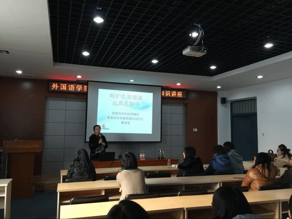 外国语学院工会于2017年12月14日下午2:00-4:00在人文馆416报告厅,面向全院女教工组织了以"呵护乳腺健康,远离乳腺癌"为主题的健康知识讲座。河北省“三三三”人才、秦皇岛妇幼保健院乳腺科副主任黄瑞雪副主任医师应邀担任主讲人。