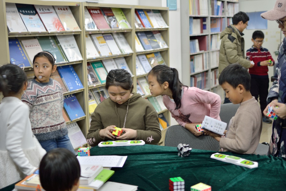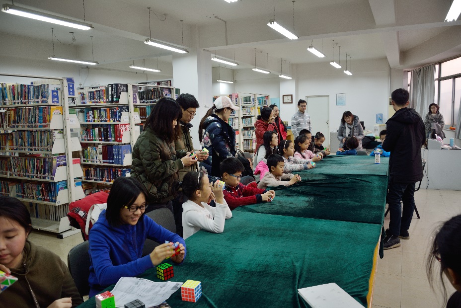 外国语学院工会于2017年12月9日下午4:00-6:00在外语学院资料室组织了亲子魔方秀活动。学院工会为此次活动购买了各种魔方,并专门邀请了我校学生魔方协会的三位同学,为孩子和家长们进行基础三阶魔方教学。家长和孩子们在老师的教授下尝还原三阶魔方的一面或多面。学习展示后,孩子们进行了魔方表演赛。