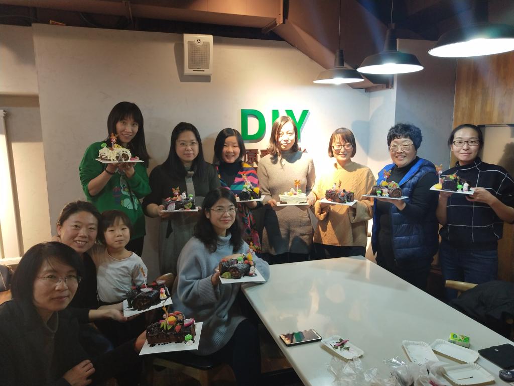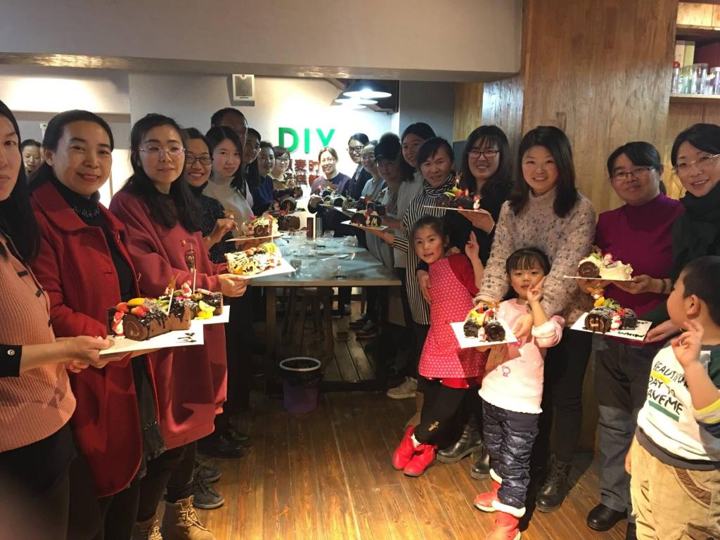 本次老师们体验的是圣诞树根蛋糕的制作,蛋糕店提前准备了蛋糕卷,奶油、时令水果、装饰糖霜人偶。在烘培老师的指导下,参加体验的老师亲手摆放蛋糕、挤奶油、装饰水果、描画树根纹路,最后拿着成品欣喜地拍照留念。有的老师的独自前来,释放一学期工作的辛劳;有的老师带孩子同来,一同享受难得的亲子时光。本次活动为老师们提供了互相交流的平台,老师们在愉快的DIY时光中共同庆祝了新的一年的到来。