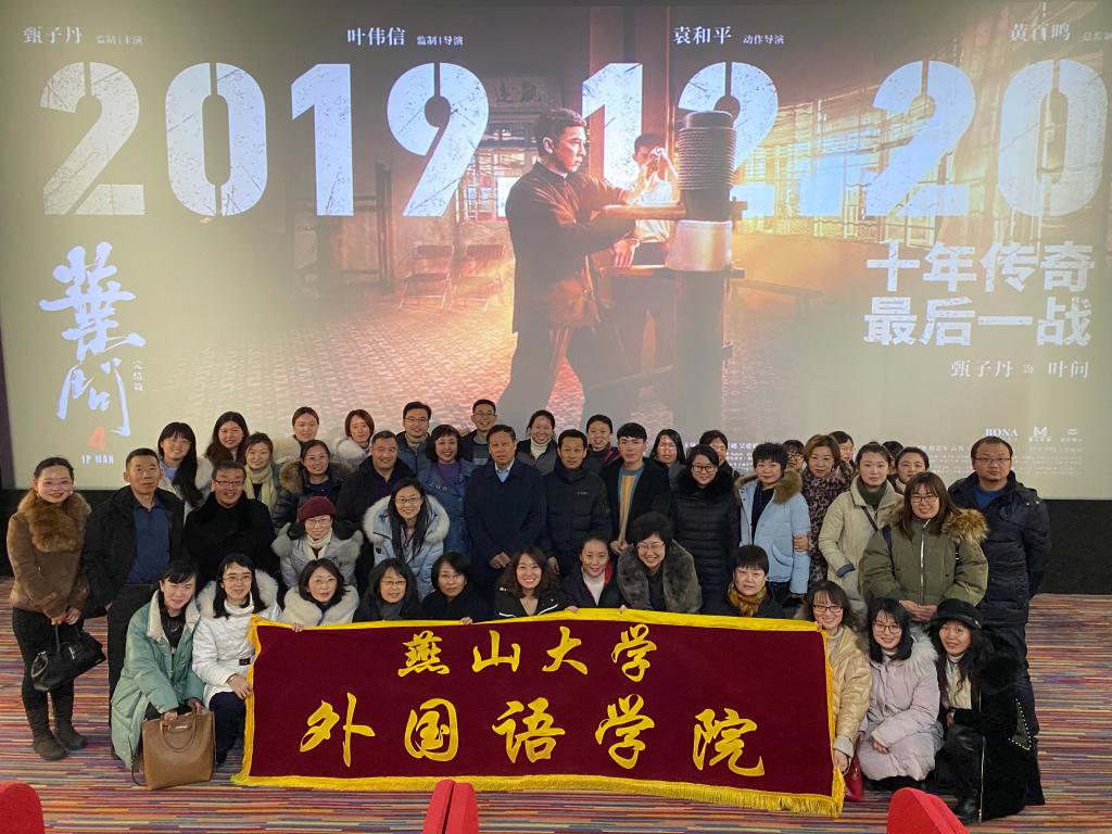 为喜迎元旦,外国语学院工会举办集体观影活动,组织教师于2019年12月24日下午观看了爱国主义影片《叶问4》。学院70余位教职工参加了活动。