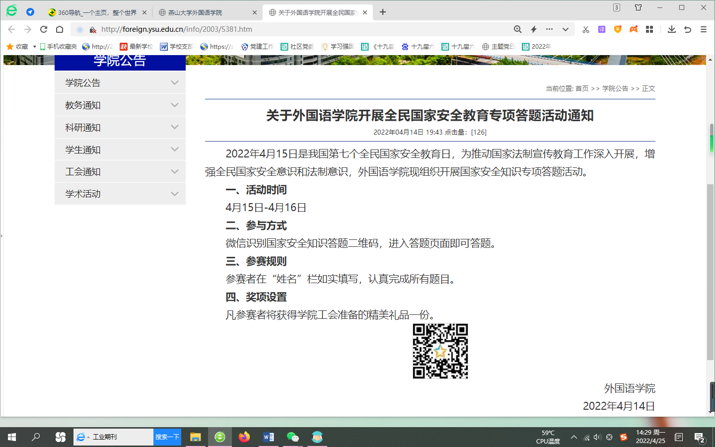 2022年4月15日是我国第七个全民国家安全教育日,为推动国家法制宣传教育工作深入开展,增强全民国家安全意识和法制意识,4月15日——16日,外国语学院工会组织开展了国家安全知识线上答题活动,40余名教工参与了答题。
