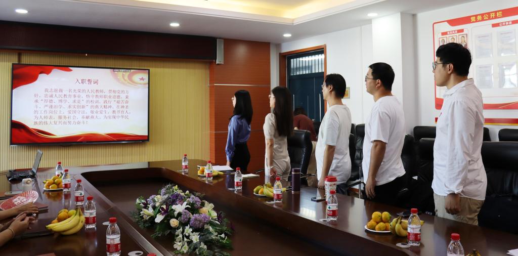 2023年,五位新教师加入外国语学院,是学院延续快速发展的基础和希望。党委书记屈晓阳、院长王林海、副院长赵志刚为新入职的教师佩戴了校徽,颁发了纪念品。新进教师宋婉玉带领全体新入职教师进行了入职宣誓,表达了为人师表、奉献教育事业的决心。新教师们表示要向前辈们虚心学习,不忘教育初心,牢记育人使命,肩负起立德树人的担当和责任。