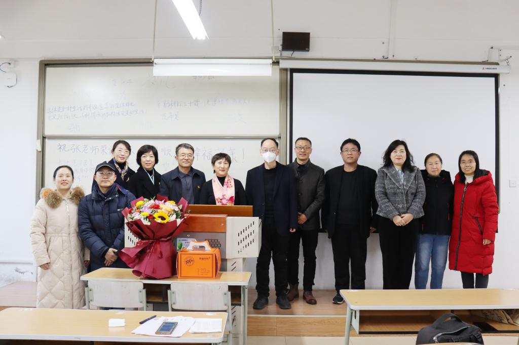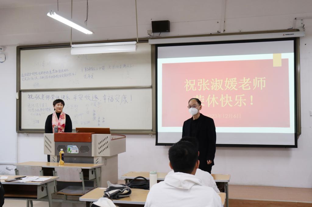 学院领导、系主任、教师代表来到教师最后一堂课的课堂上,同学生们共同见证这个具有特殊意义的时刻。同学们在黑板上写满了祝福语,研究生英语系教师代表学院向张老师赠予了鲜花和纪念品,学院党委书记和院长王林海对张老师多年来在教育教学、科学研究、人才培养等方面为学院发展做出的巨大贡献表示感谢,并希望张老师保重身体,常回学院看看,退而不休。