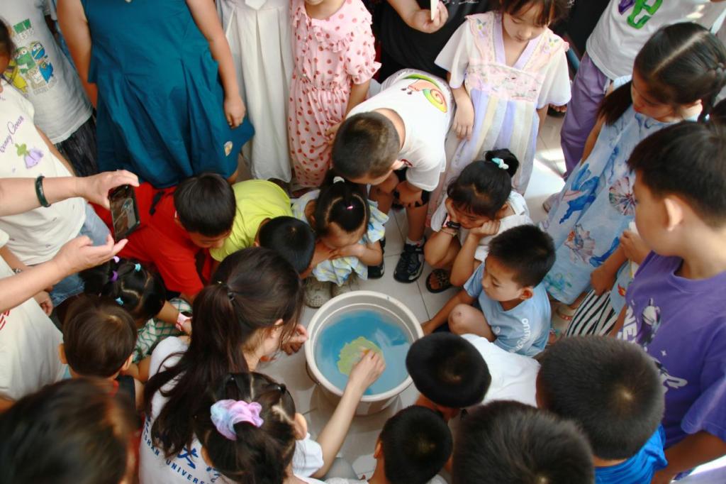其后,实践团成员段晨曦、王雨晴带领孩子们“沉浸式”体验漆扇和衍纸两项非遗文化,从历史背景、制作工艺以及特色做法进行介绍。漆扇体验中,随着团扇缓慢放入转动,开“盲盒”般的漂漆技艺让大家惊艳赞叹;衍纸制作中,一卷、一捏、一折,充满爱心的衍纸作品应运而生。随着体验的结束,孩子们对非遗技艺所需沉着专注的工匠精神有了更多的感悟,对中华优秀传统文化源远流长和创新发展的强大生命力有了直观地感受,纷纷表示“太神奇了”“还想再体验一次”。