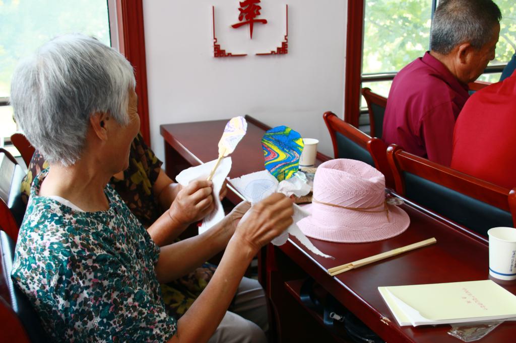 其后,实践团段晨曦、霍一哲向在场党员展示了竹编和漆扇两项非遗技艺背后的故事,通过视频展示了竹编、漆扇不同时期的作品,随着颜料滴入水中,扇面轻轻摇动,大家在水波流动间勾画出各种斑斓的色彩,制作出独一无二的团扇;在“一挑一压”编织技法下,普通的竹条被巧妙地编织成一幅幅栩栩如生的图案,展现了盛世中华的辉煌、长征精神的坚韧以及中国梦的远大。参与其中的党员感慨道:“非遗技艺不仅与红色精神交相辉映,更与优秀传统文化和革命文化实现了完美的融合,这不仅是一次独特的体验,更是对历史的致敬。”