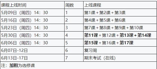 通过在线学习平台(具体详见附件2)进行录播课程学习。课程(包括复习、考试)共7周,17次(34学时),其中必修课12次(24学时)。平台每周将上架更新2-3节课。