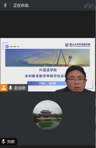 汇报结束后,刘明教授对外国语学院取得的成绩进行了肯定,然后从OBE理念的落实、课程目标达成度、人才培养方案的制定和人才培养效果、教师教学质量评价、教师发展和教研素养提升、学院制度建设等几个方面提出了具体的改进意见和措施。